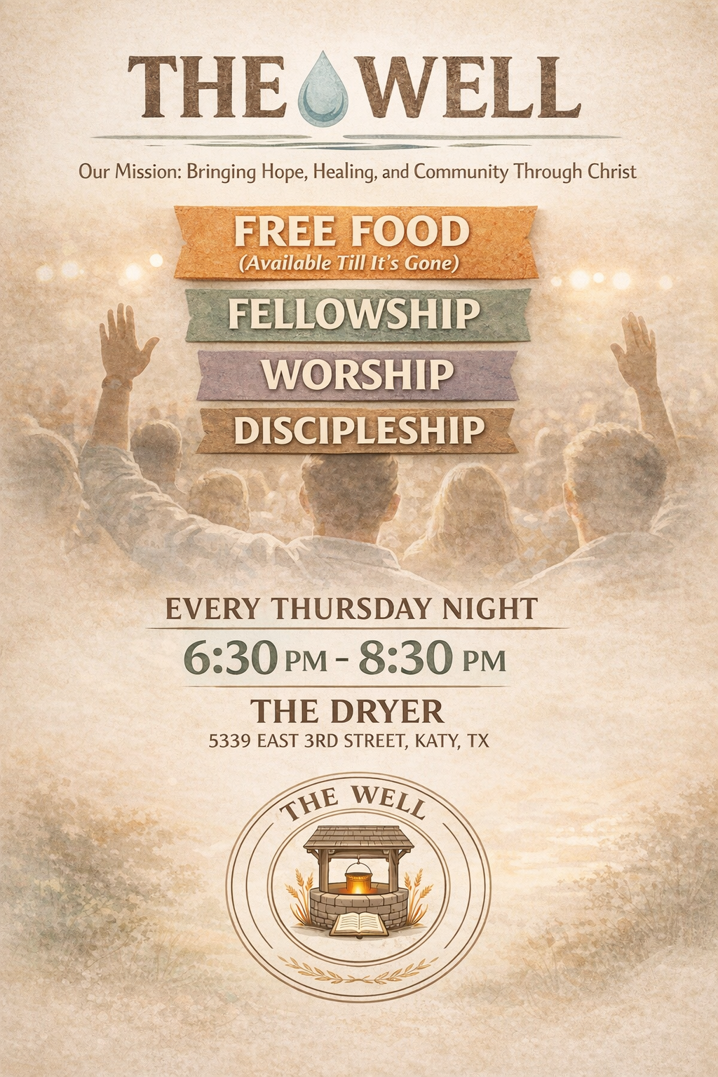 The Well of SomeArea is more than just a gathering; it's a compassionate community built on the values of prayer, worship, and genuine care. We are not a church and not a fundraiser. Rooted in Katy, Texas, we strive to create a welcoming space where everyone can find solace and connection. Our first mission, The 1 of 99 Blessing, ensures that no one is overlooked, fostering a culture of integrity and transparency.